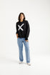 This relaxed sweater features a drop shoulder design and a Lilac Damask patterned X detail on the chest, adding a modern touch.